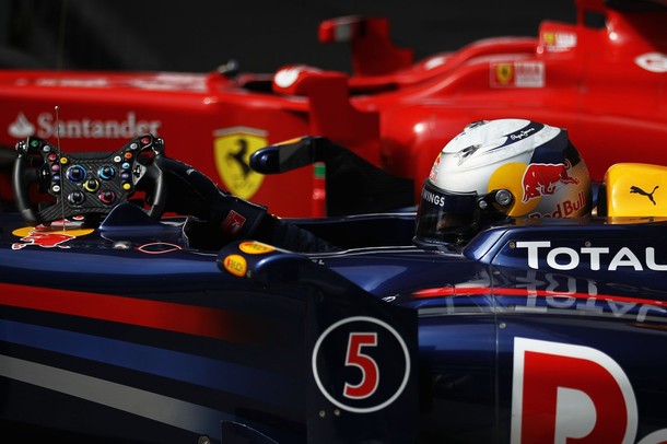 Los motivos son varios. Empezando por la salida, Webber salió mejor que Vettel y se puso al frente, lo que significaba que en la primera parada para poner los neumáticos intermedios,Vettel tenía que esperar a Webber en boxes, perdiendo un tiempo precioso. Para perder menos posiciones, Vettel reducía la velocidad en su camino hacia los boxes, entorpeciendo a los pilotos que estaban detrás suyo y que no le podían adelantar. En 2005, en este mismo circuito,Fisichella fue penalizado por hacer esto, pero ya os habréis dado cuenta de que en esta carrera hubo “barra libre”. Gracias a esta acción, perdió menos posiciones, pero 3 vueltas más tarde tuvo que volver a poner los slicks en otra parada controvertida por circular en paralelo conHamilton por todo el pit-lane.